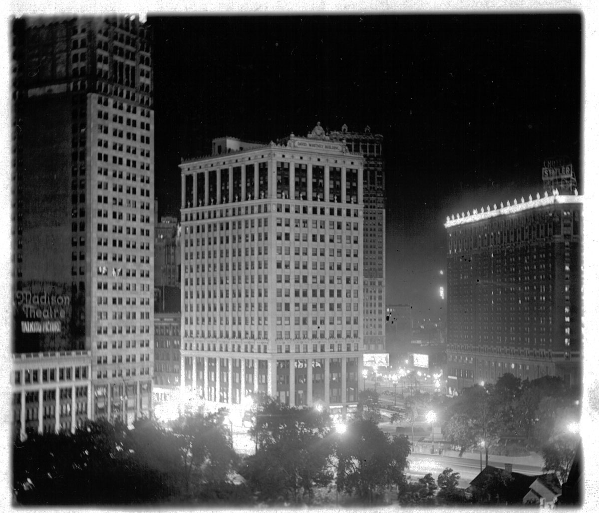 From left to right we see the Madison Theatre (with "Talking Pictures"), the Eaton Tower (now known as the David Broderick Tower), The David Whitney Building (Note the original building marquee), and the Statler Hotel (all liit up!). Woodward Avenue is shown running from left to right.